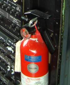 ![]() Cockpit Fire ExtinguisherIs BCF and works by removing oxygen from the fire triangle of oxygen - heat - fuel. As it does not directly cool the fire, when oxygen returns, so could the fire. To operate, remove ring and press down on top lever. Hold upright and beware, BCF fumes are toxic. |