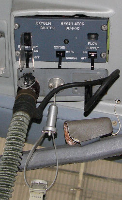 The oxygen regulator has three modes: Normal: Red latch on left is up - Gives air/oxygen mix on demand. Use if no fumes are present eg decompression. 100%: Push red latch on left down - Gives 100& oxygen on demand. Use if smoke or fumes are present. Emergency: Rotate red knob clockwise - Gives 100% oxygen under pressure. Used to clear mask & goggles of fumes and should also be used if aircraft is depressurised above 39,000ft. |