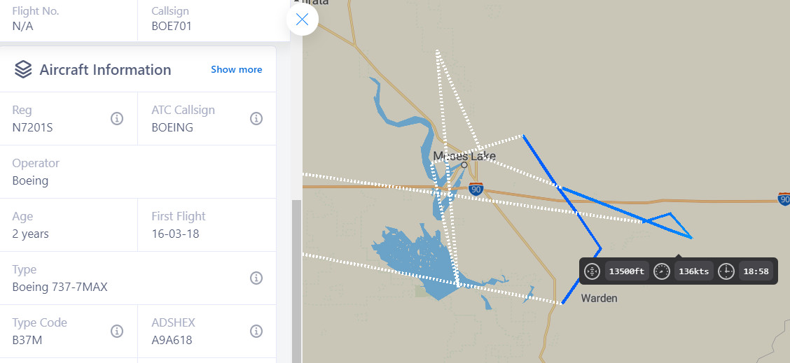 Other tests:Now flying with CFM Leap-1B compliance engines, airplanes two, three and four will eventually get fitted with final delivery engines that have new low-pressure compressors (LPC). Those engines, which Teal said would start arriving around August 2016, will require what he characterized as some minor additional testing. Last year CFM discovered the need to modify the LPC to improve stall margin. With the original engines, Boeing has to use suboptimum bleed schedules, leaving the bleeds open more than desired for the best possible fuel efficiency. “We want the bleeds closed for better fuel mileage,” explained Teal. “We could have certified and delivered these engines, but we wanted the best engines. So in the ones we’re flying now the bleeds are opened a little bit more than we desire, but when the final Block 2s come in and we get the final bleed schedules, and that will determine the final configuration.” Further evaluations will be conducted late in the program on the delivery-standard Leap 1B engine with an improved low-pressure (LP) compressor configuration. The current fleet is powered by compliance versions of the -1B engine, and Boeing expects to receive the upgraded powerplants, “in the August time frame,” says Teal. “We plan on putting them on Aircraft Two, Three and Four. We won’t put them on Aircraft One because that airplane essentially [will be] done with its [test] life.” Testing will include natural icing and other minor evaluations, he adds. Improvements were made to the LP compressor after testing indicated it was necessary for bleed valves to remain open for longer than expected to maintain adequate stall margin. “They didn’t have to be open all the time. The bleed schedules open and close the valves, so to improve stall margin, we want the bleeds closed for better fuel mileage,” Teal explains. “CFM could have certified the existing engines, and they did, but we wanted the best engines. The bleeds are open a little more than desired on the engines that are flying now, but when the final Block 2s come in, we will get the final bleed schedules that will determine the final configuration.” MCAS Flight Testing14 March 2019 the 737 MAX was grounded following two accidents in which the MCAS system was implicated. As part of the recertification a flight test program was undertaken with the redesigned MCAS system. The program would comprise 1300 test flights. 16 Apr 2019 the MCAS flight test program concluded after 120 flights / 203 hours flight test time. The Boeing CEO, Dennis Muilenburg flew on a 737 Max demonstration flight, where he “saw first-hand this software in its final form, operating as designed across a range of flight conditions”. 15 May 2019 Boeing completed development of the software update, simulator testing and engineering test flights for the 737 MAX. In a statement, the company said that it has flown the updated software on the 737 MAX for more than 360 hours on 207 flights. “We are now providing additional information to address the Federal Aviation Administration (FAA) requests that include additional detail on how pilots interact with the airplane controls and displays in different flight scenarios,” the statement said. “Once the requests are addressed, we will work with the FAA to schedule their certification test flight and submit final certification documentation.” 5 Aug 2019 the Boeing CEO, Dennis Muilenburg said that the MAX has conducted almost 500 test flights with the new FCC software. Muilenburg said that he has personally flown on two of the test flights, and that Boeing employees are “eager to do the same.” A MAX MCAS flight test. Note the airspeed and offshore location, clearly indicating low speed flight testing The above graphic shows a 737 MAX 7 that took off from King County International Airport-Boeing Field near Seattle. It climbed to 24,000 feet as it headed west to the Pacific Ocean, then due south. The aircraft then descended to 13,000 feet and 250kts, about 50 miles off the Oregon coast. The aircraft then operated for almost two hours in the block between 10,000 to 14,000ft at speeds of between 130 and 300kts before climbing to recover back to Boeing Field. The pilots of the test flights, Boeing revealed, are Jennifer Henderson and Jim Webb. Henderson, a former engineer and U.S. Air Force pilot, is the chief pilot for 737s at Boeing, who has also served Boeing as the flight test director for the 787 Dreamliner and the chief test pilot for the 737 MAX-7 during her 14 years with the company. Webb, Boeing's chief pilot for commercial airplanes, is a former U.S. Navy test pilot who as recently as last year held Henderson's role as chief 737 pilot. “Of course the expectation is we know how to fly the airplanes and are experts in the systems. We also have to have an awareness of how the manufacturing system works, how the testing goes from beginning to end, the business aspects and the direct link between our customers and our products," said Webb. Both Henderson and Webb were required to sign off on the 737 MAX's new system before it was allowed to take to the air.