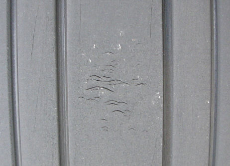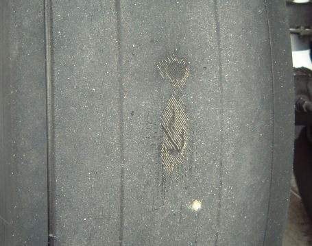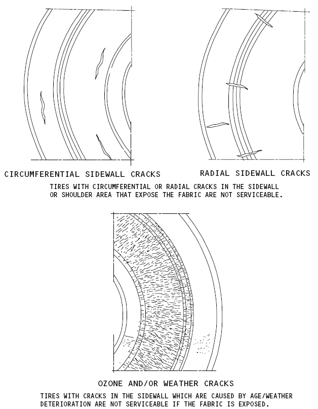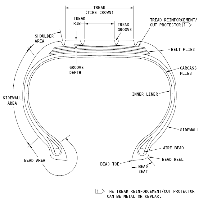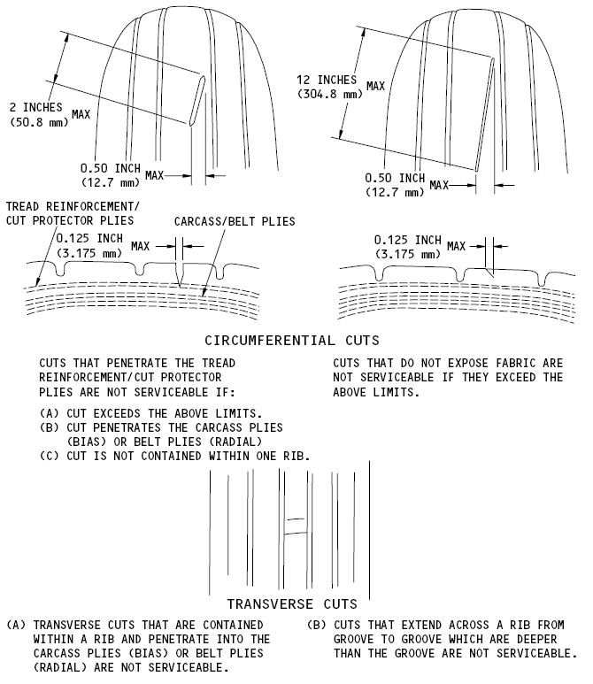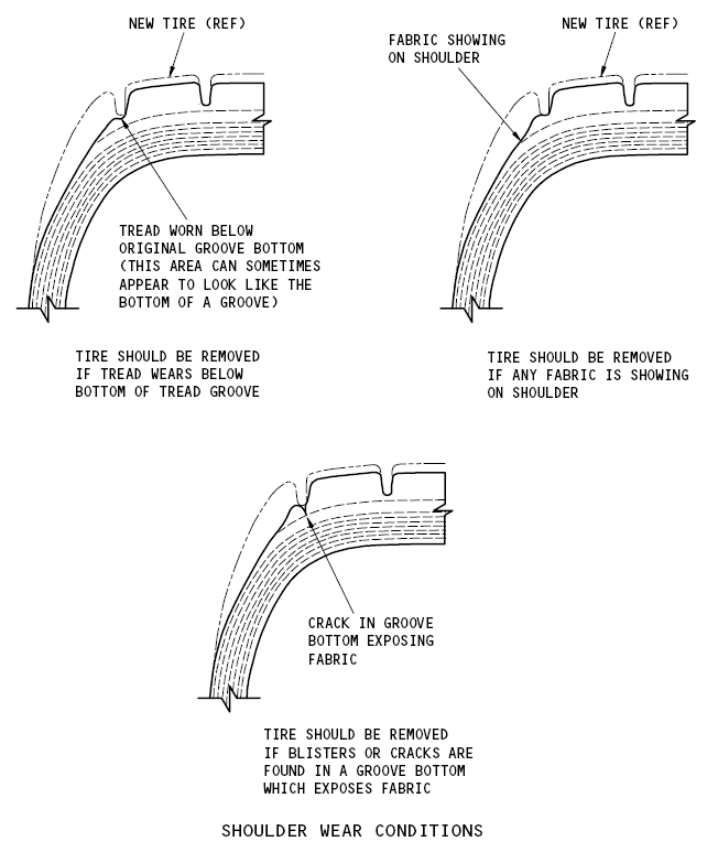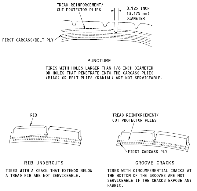 NOTE: If the tread reinforcement/cut protector (steel) shows, the tire may be used without safety concerns, but if the tire is left in service you may not be able to re-tread the tire. In simple terms: Tires should be removed when tread has worn to the bottom of any groove at any spot. Tires have varying numbers of plies, and on some tires, wearing through any layers leaves too small of a safety margin. Wearing to the bottom of the groove is the best compromise point between safety and obtaining the most landings. |