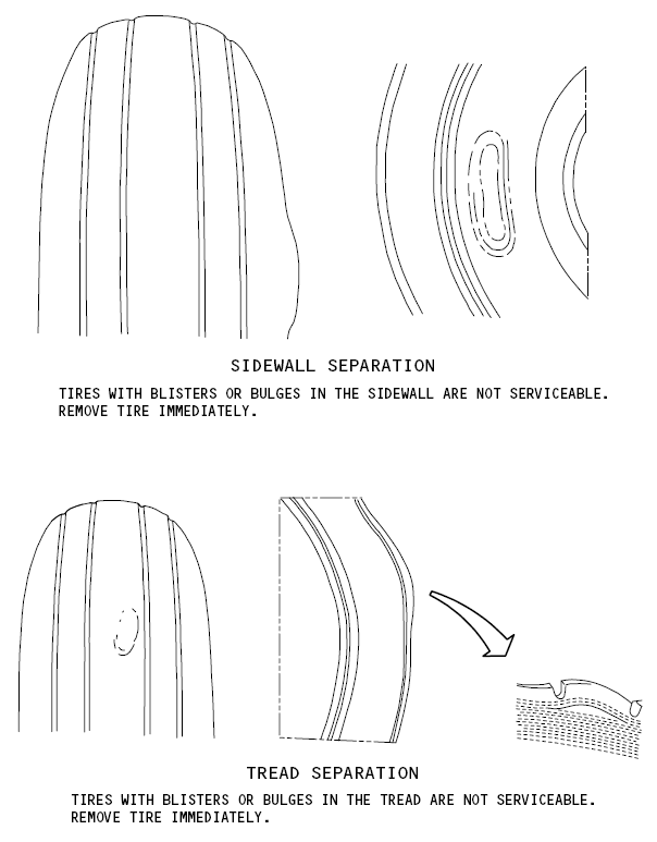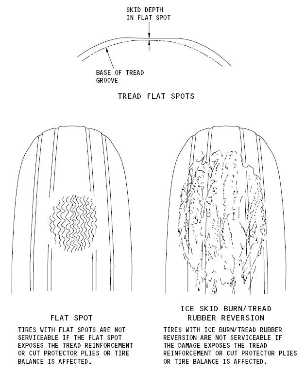 Tires with flat spots are not serviceable if the flat spot exceeds the tread reinforcement or cut protector plies or tire balance is affected